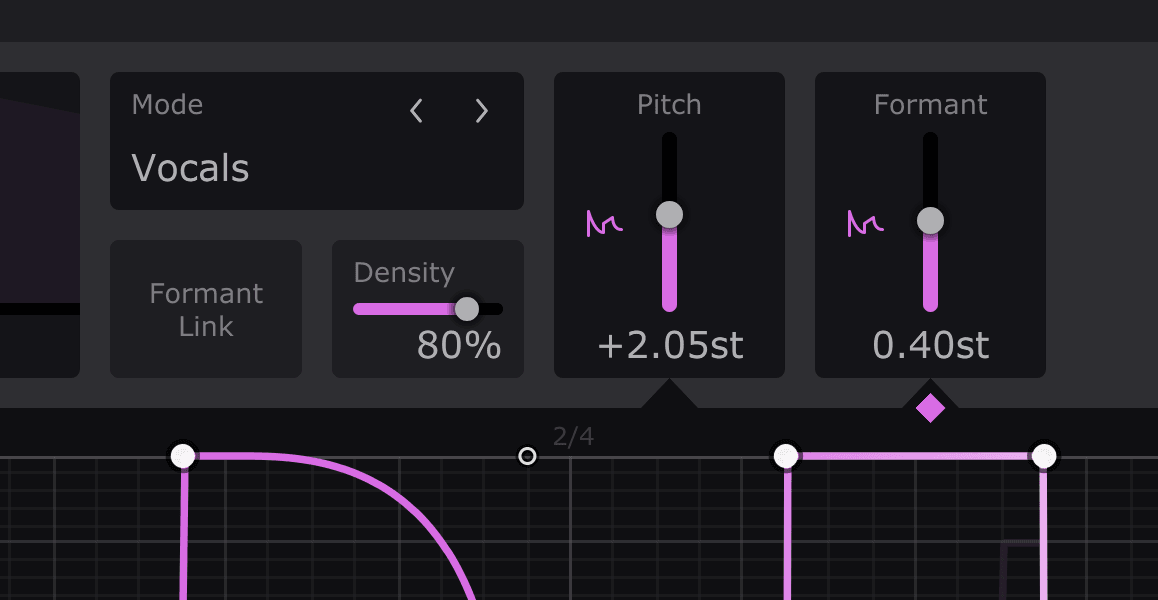 Vocals and Drums modes feature a Formant control with its own drawable LFO, envelope follower, and a special Density parameter for smoother results.