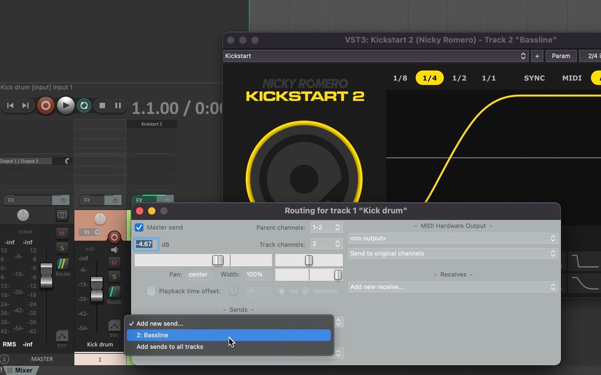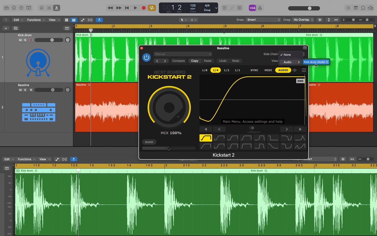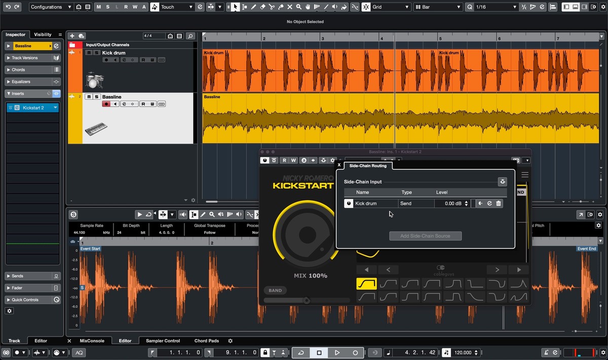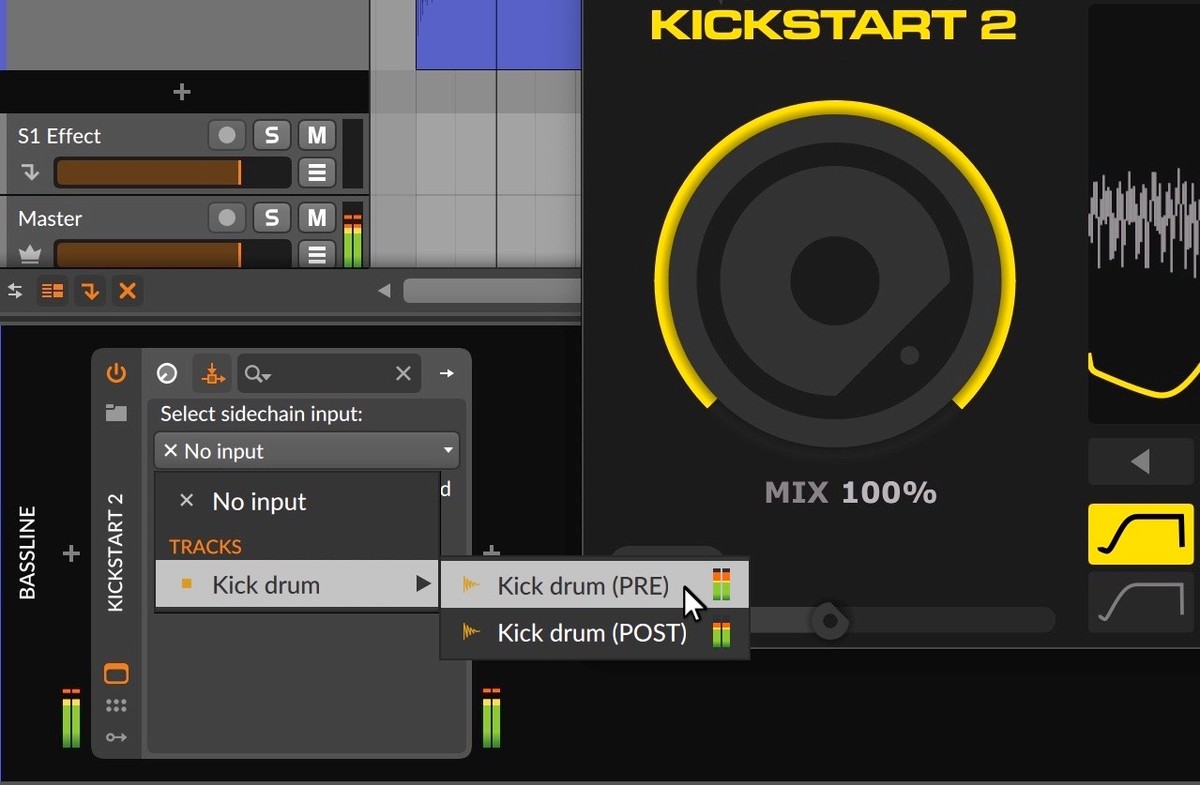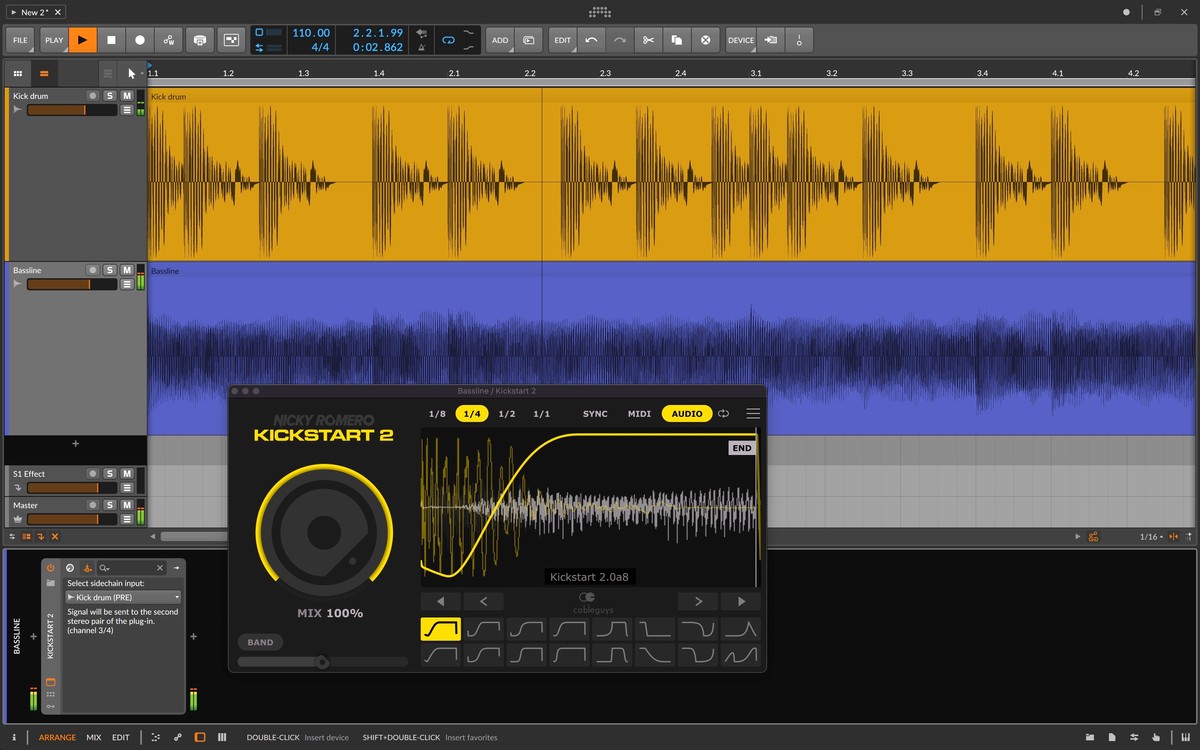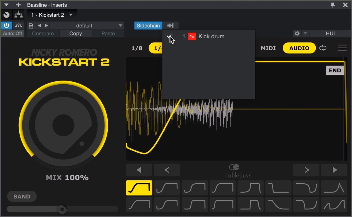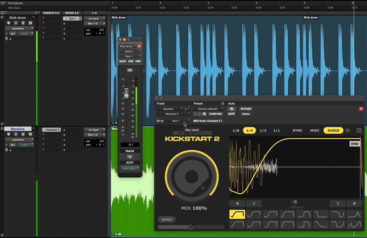 To use the Audio Trigger and Kick View features, Kickstart 2 needs to "hear" your kick drum track. This is done by routing the kick via your DAW into Kickstart's external sidechain input. Here's how to do it in the most popular DAWs.