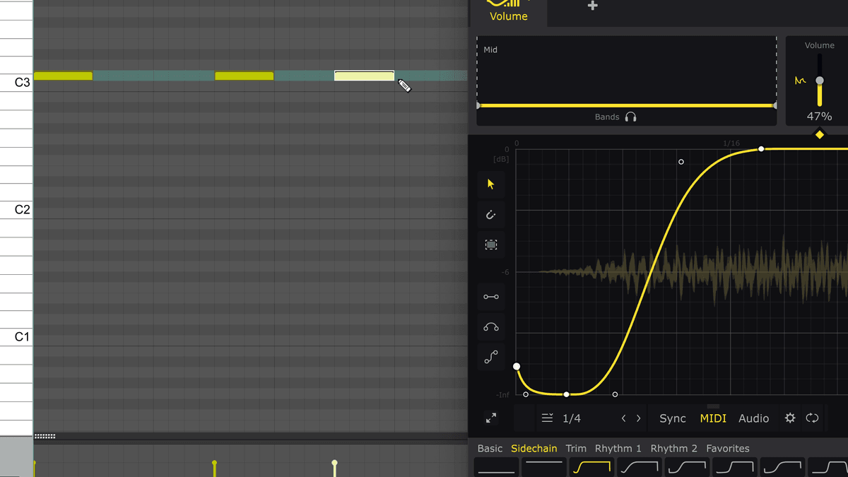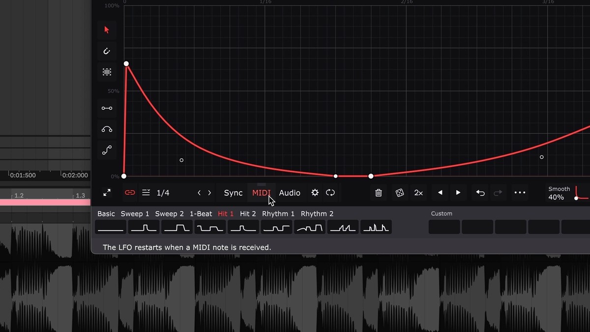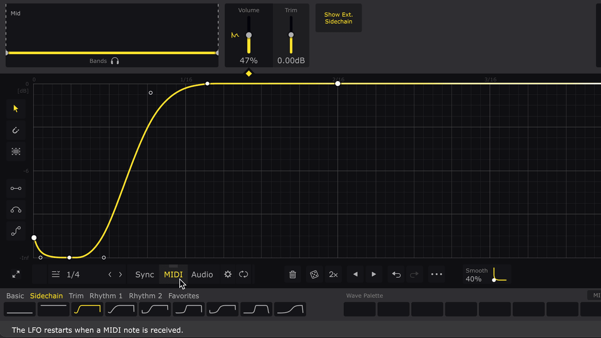 When this technique is used, the LFO will play from the beginning every time a MIDI note is received. Thus, the LFO can be triggered in any rhythm you like – sidechain your bassline to a non-4/4 kick drum pattern, for example.