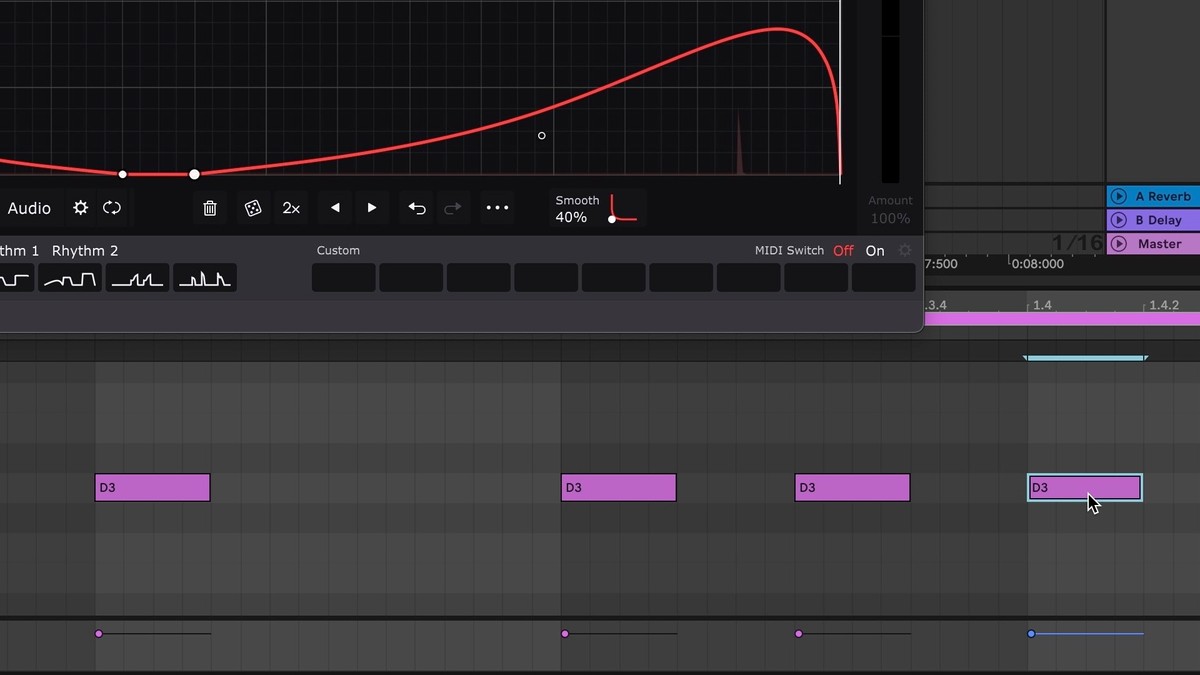 - On a new MIDI Track, create a MIDI clip and add MIDI notes in the rhythm that you want to trigger the Cableguys plugin.