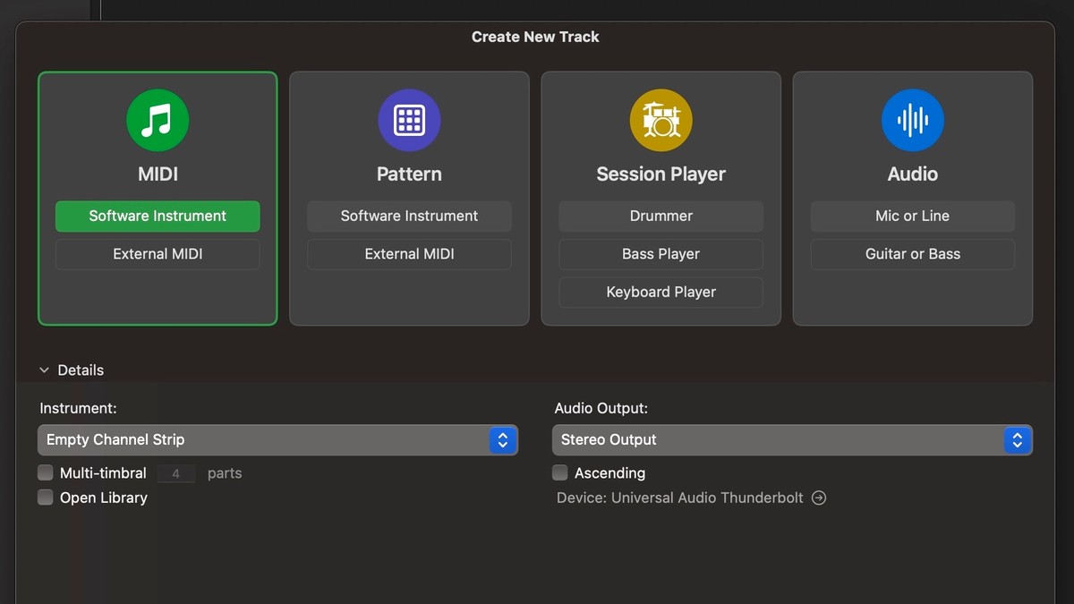 - Add a new track (⌥⌘N), choosing 'Software Instrument'.