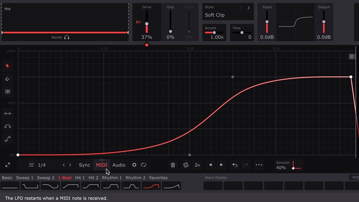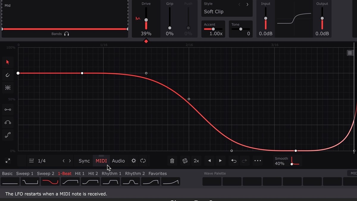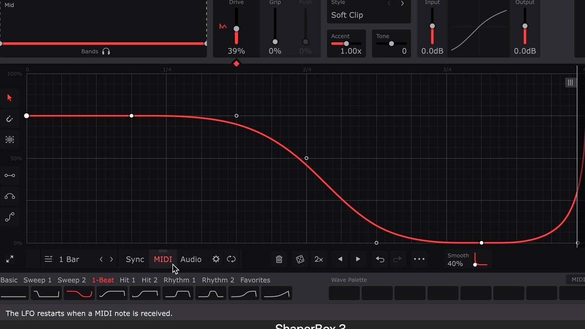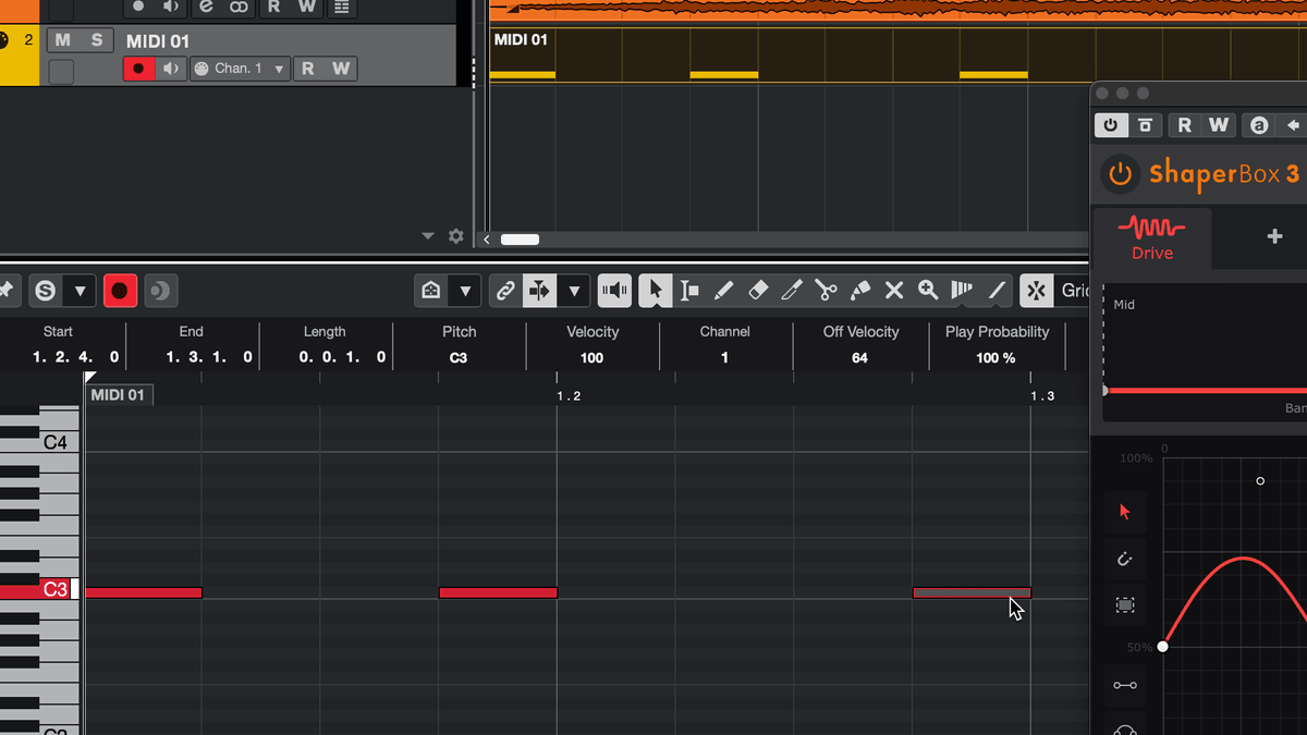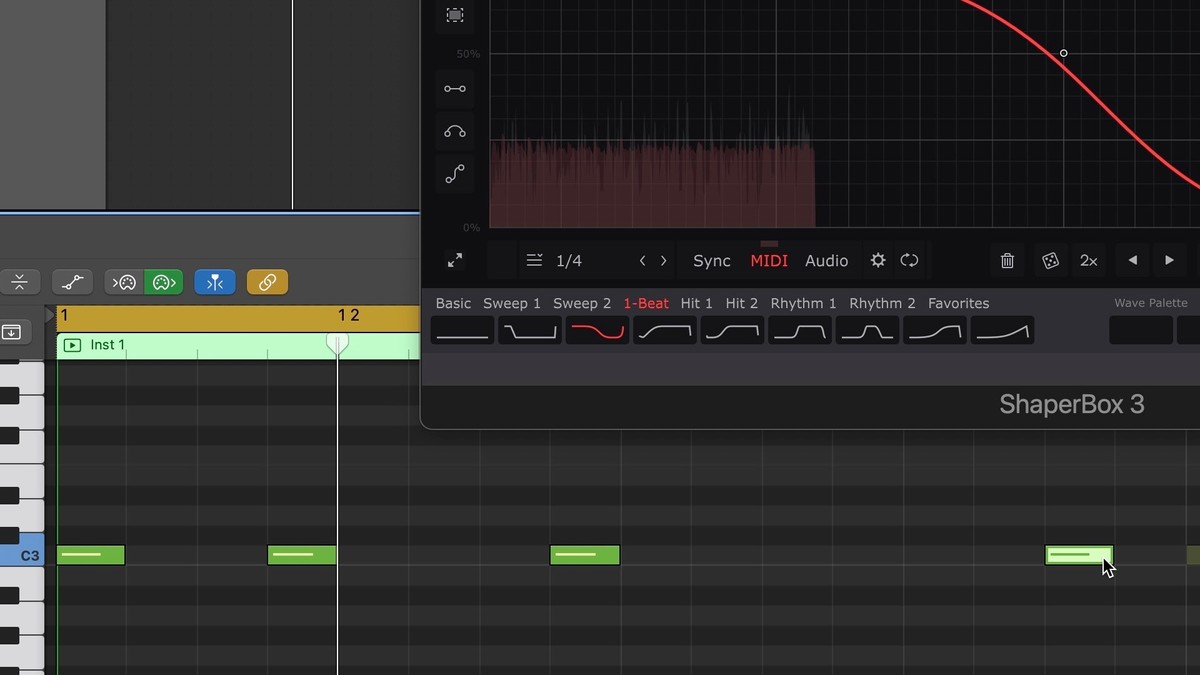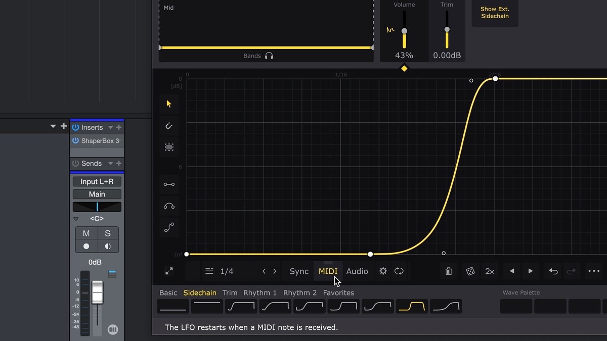 - Now, the LFO is triggered every time it receives a MIDI note from the MIDI track, so record or draw in MIDI notes as required. Any MIDI note will work, unless you're also using ShaperBox's MIDI Switch function, in which case only C notes in all octaves will trigger the LFO.