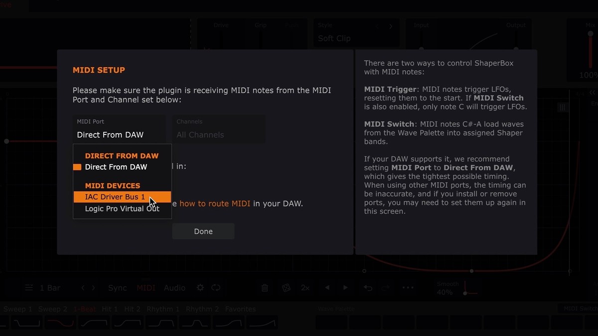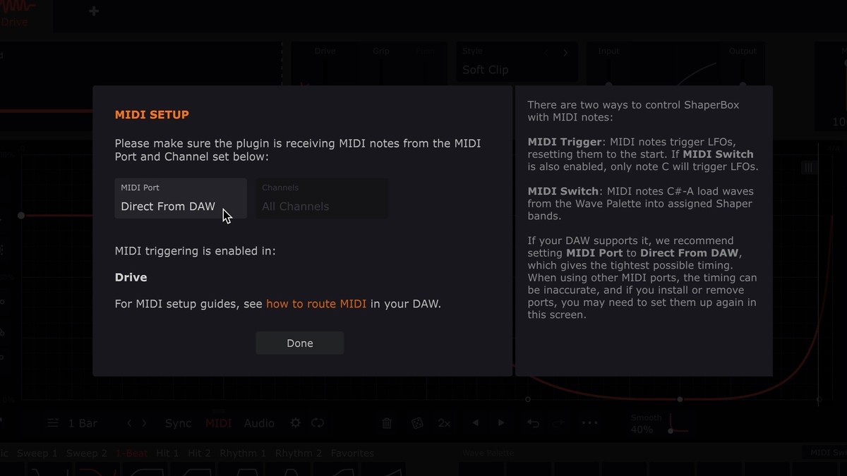 - In ShaperBox 3, FilterShaper XL and MIdiShaper turn on MIDI Trigger mode by clicking the MIDI button below the Wave Editor or in MidiShaper’s Source A, B, C or D section. In Snapback, select the MIDI option in the Trigger panel. In PanCake, select a 'MIDI Triggered' or 'MIDI 1-Shot' triggering mode. In ShaperBox 2, set the 'MIDI Trigger' mode to 'On' or 'On (1-shot)'.