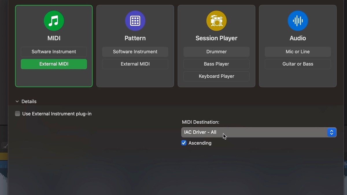 - Add a new track (⌥⌘N), choosing 'External MIDI' as the track type, disabling the 'Use External Instrument plugin' option, and setting the Output to the IAC driver port (eg, 'IAC Driver Bus 1').