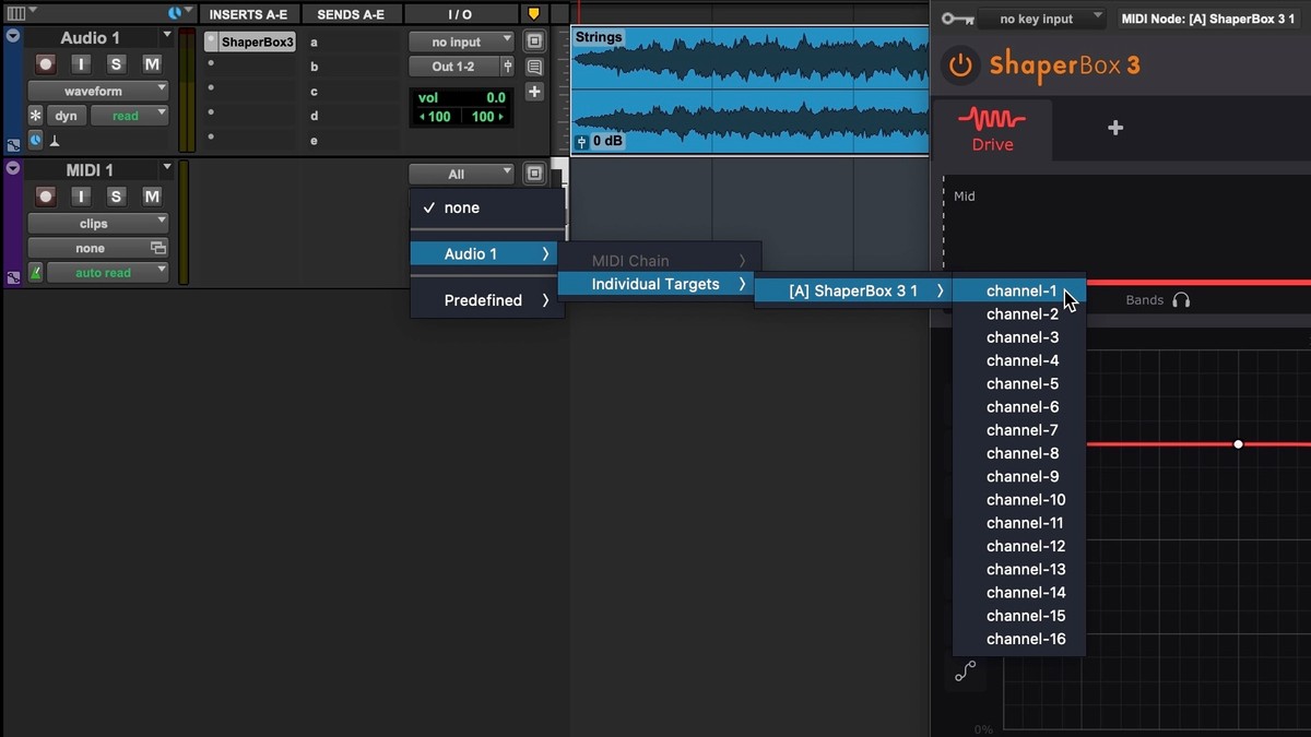 - Back in Pro Tools, create a MIDI track and, in the hierarchical Output menu, select the track hosting, for example, ShaperBox, then 'ShaperBox 3’ (or both of those options in a single entry if ShaperBox 3 is the only plugin on the track), then 'channel-1' (or whichever MIDI channel you want to use).