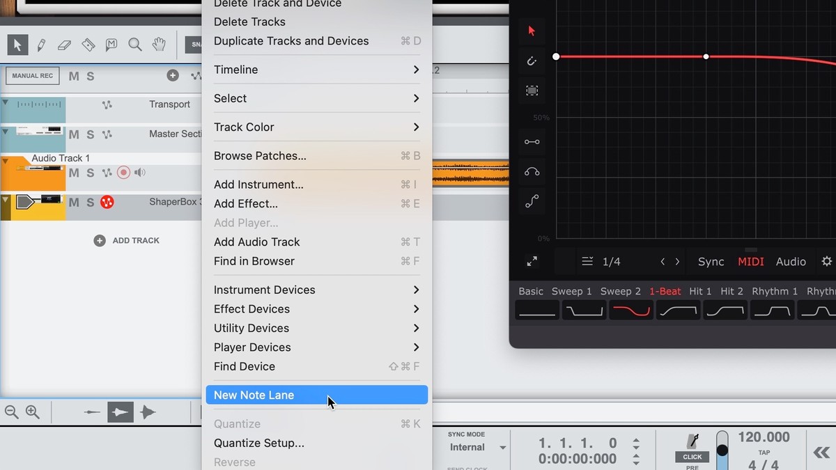 - Right-click the Cableguys plugin Device in the Rack and select 'Create Track for name of Cableguys plugin 1'. A Track will appear in the track list – right-click it and select 'New Note Lane'.